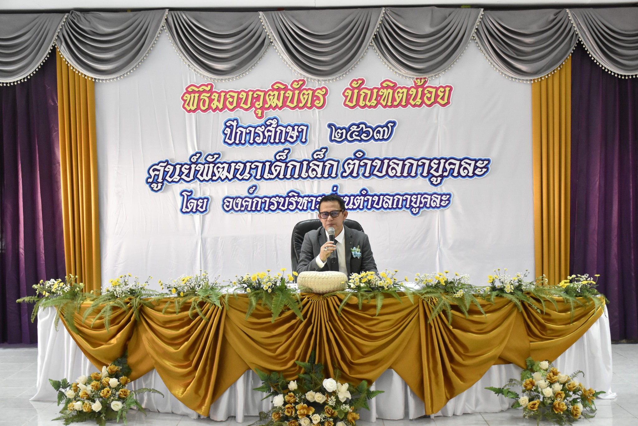 วันที่ 25 มีนาคม 2568 นายวันชัย อีซอ นายกองค์การบริหารส่วนตำบลกายูคละ เป็นประธานในพิธีเปิดงานพิธีมอบวุฒิบัตร บัณฑิตน้อย ปีการศึกษา 2567 พร้อมด้วยคณะผู้บริหาร สมาชิกสภาอบต.กายูคละ ผู้ใหญ่บ้าน คณะกรรมการศพด.กายูคละ พนักงานและเจ้าหน้าที่อบต.กายูคละ และผู้ปกครอง ร่วมแสดงความยินดีกับบัณฑิตน้อย