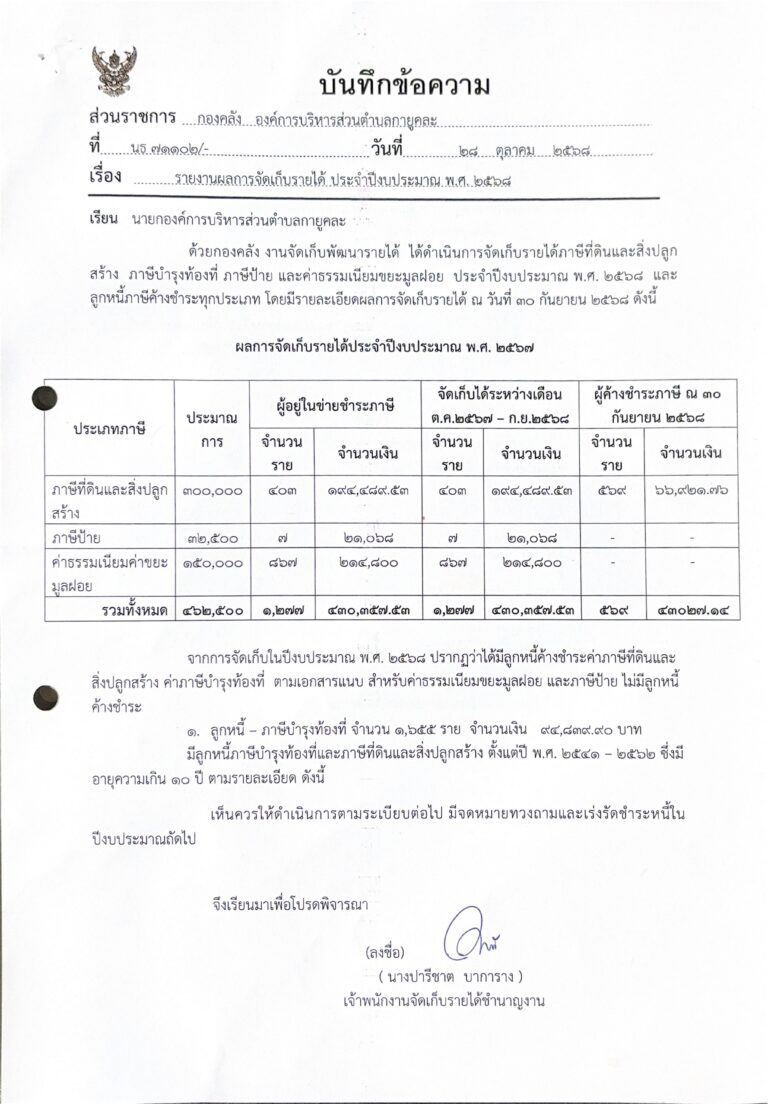 รายงานผลจัดเก็บรายได้ ประจำปีงบประมาณ พ.ศ.2568
