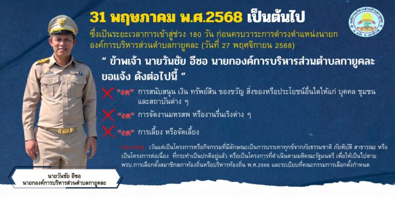 วันที่ 4 มิถุนายน 68 นายวันชัย อีซอ นายกองค์การบริหารส่วนตำบลกายูคละ พร้อมด้วยคณะผู้บริหาร ปลัด อบต.กายูคละ หัวหน้าส่วนราชการ ร่วมให้การต้อนรับคณะผู้เดินทางมาส่ง และแสดงความยินดีกับนางสาวอาตีเก๊าะ หนิจิบุลัด เนื่องในโอนย้ายไป ตำแหน่งเจ้าพนักงานพัสดุ ปฏิบัติงาน ณ องค์การบริหารส่วนตำบลกายูคละ อำเภอแว้ง จังหวัดนราธิวาส ณ ห้องประชุมชั้น2 องค์การบริหารส่วนตำบลกายูคละ อ.แว้ง จ.นราธิวาส